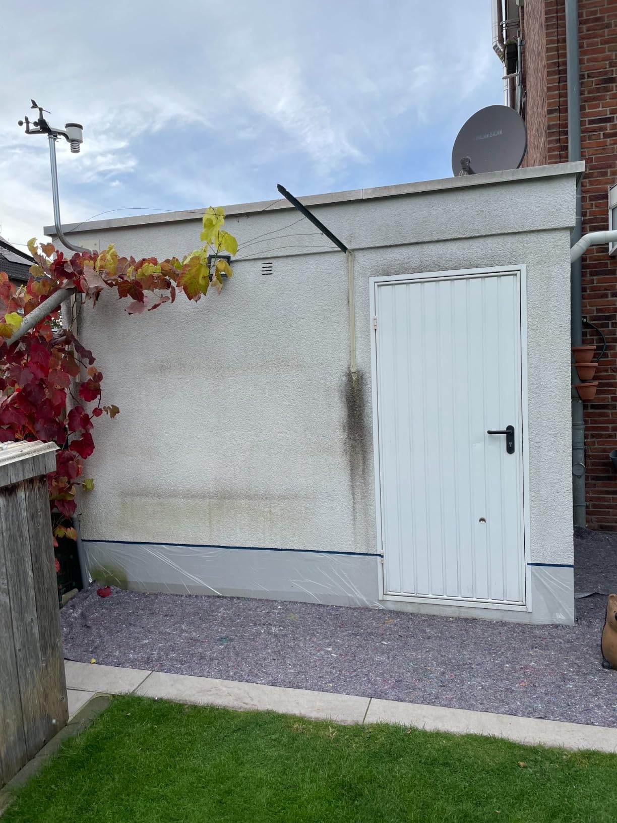 Verwitterte Dispersionsbeschichtung mit dunklen Feuchteverfärbungen und Algenbelastung fachgerecht überarbeitet. Die Streifen entstanden durch dauerhafte Feuchtebeanspruchung der gealterten Altbeschichtung. Mit Derendo® Silikonharz-Fassadenfarbe Ultra erhielt die Oberfläche eine homogene, wasserabweisende und diffusionsoffene Schutzschicht – für ein sauberes, dauerhaft geschütztes Fassadenbild.